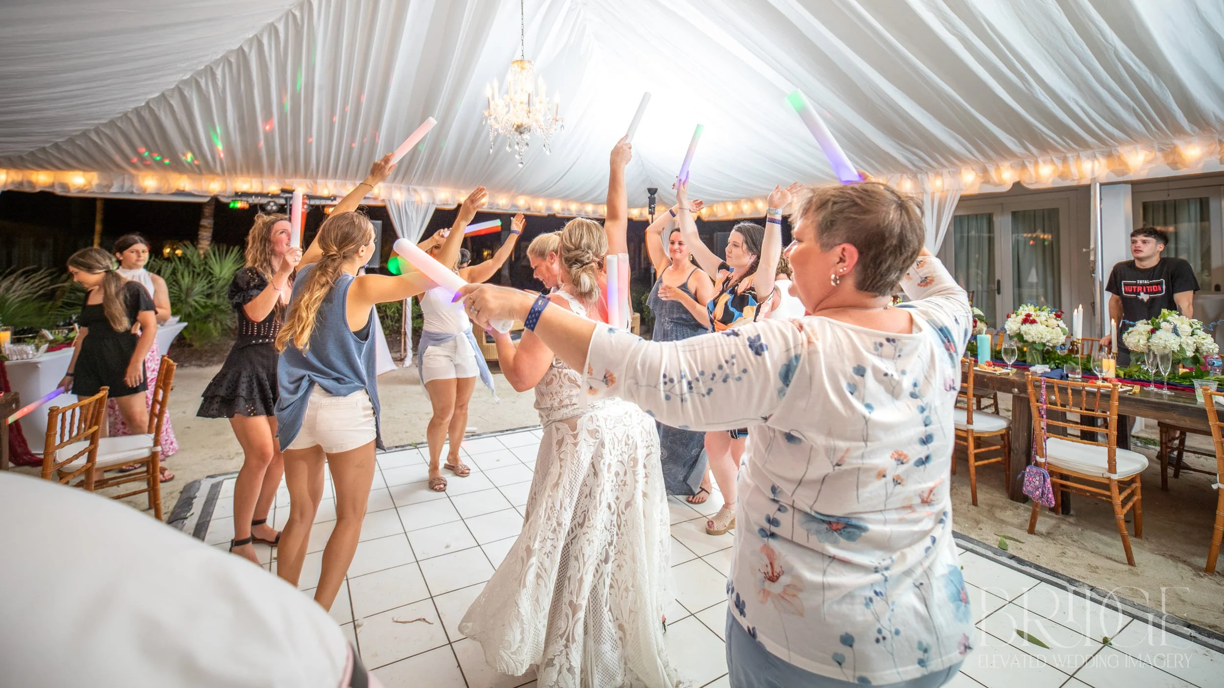 As the evening unfolded, DJ Jimmy Cooper ensured the celebration remained lively and vibrant. The couple enjoyed a blessing by one of the bridesmaids, toasts and speeches by several family members and friends, and as they sat at their head table looking on to their loved ones, a stunning rainbow even came out to add to the colorful decor! As the night continued, they incorporated fun props like foamy glow sticks and light-up sunglasses, adding a playful and energetic atmosphere to the party.